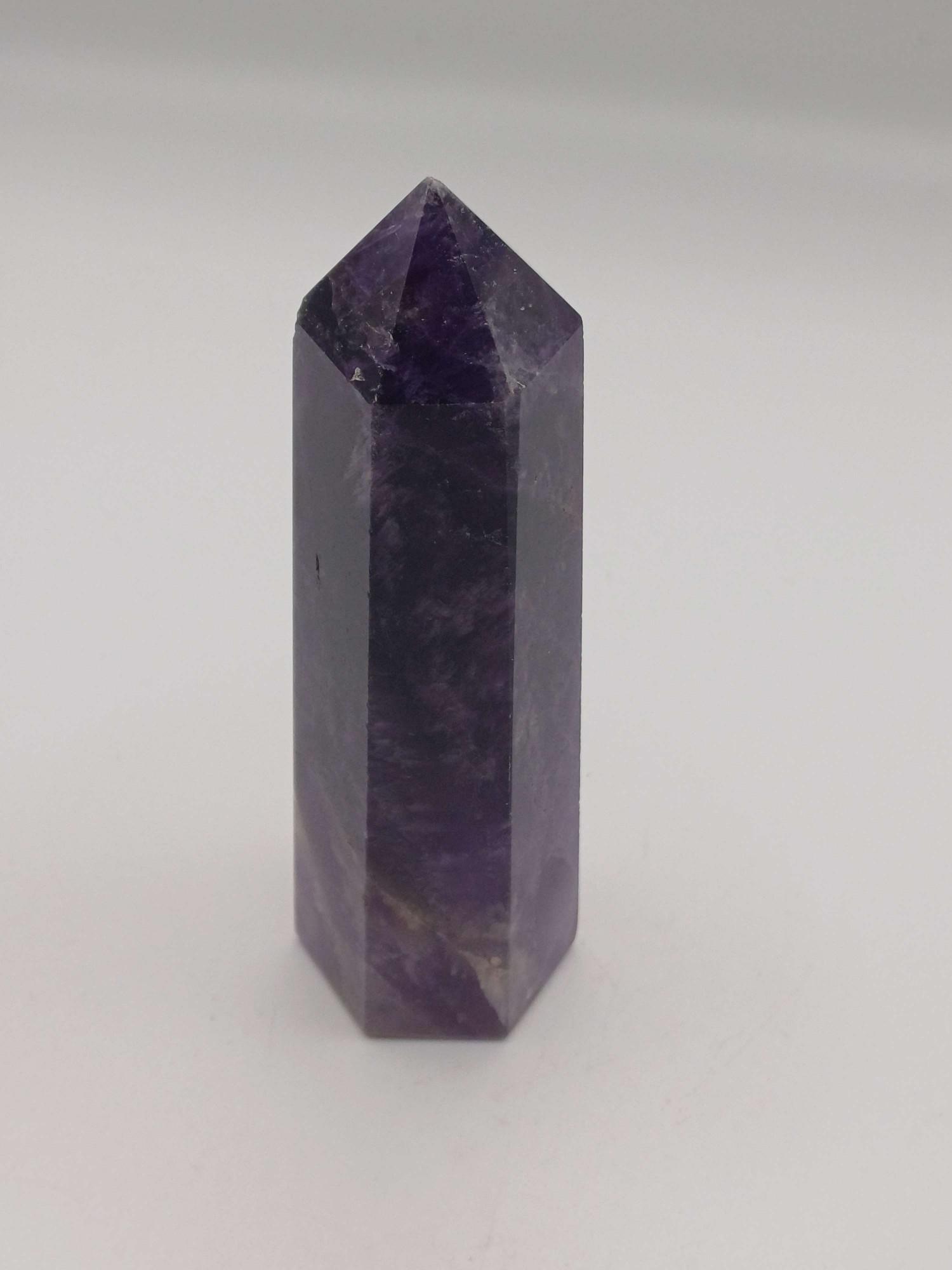 This 8cm amethyst crystal point wand may be slightly smaller, but it still carries the same powerful energy and natural beauty as its larger counterpart. Each wand is polished to a smooth finish, showing off the chevron-style purple patterns that make amethyst so distinctive.