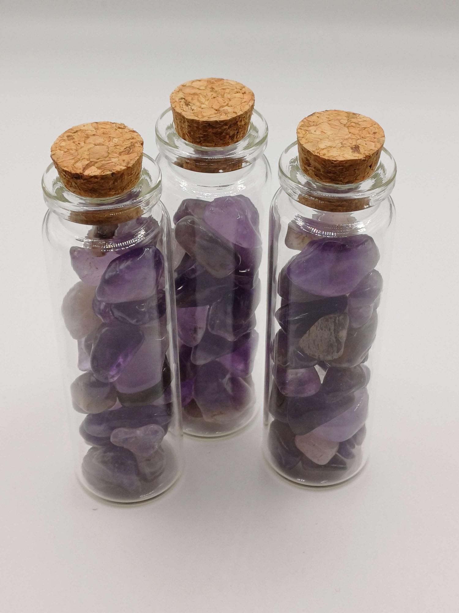 Think of this as the grown-up sibling to the mini: a fuller bottle packed with natural amethyst stones for a richer hit of purple and a little extra presence on the shelf. It’s still simple – clear glass, cork top, real crystal – but there’s more colour, more texture, and more to look at when the light hits.