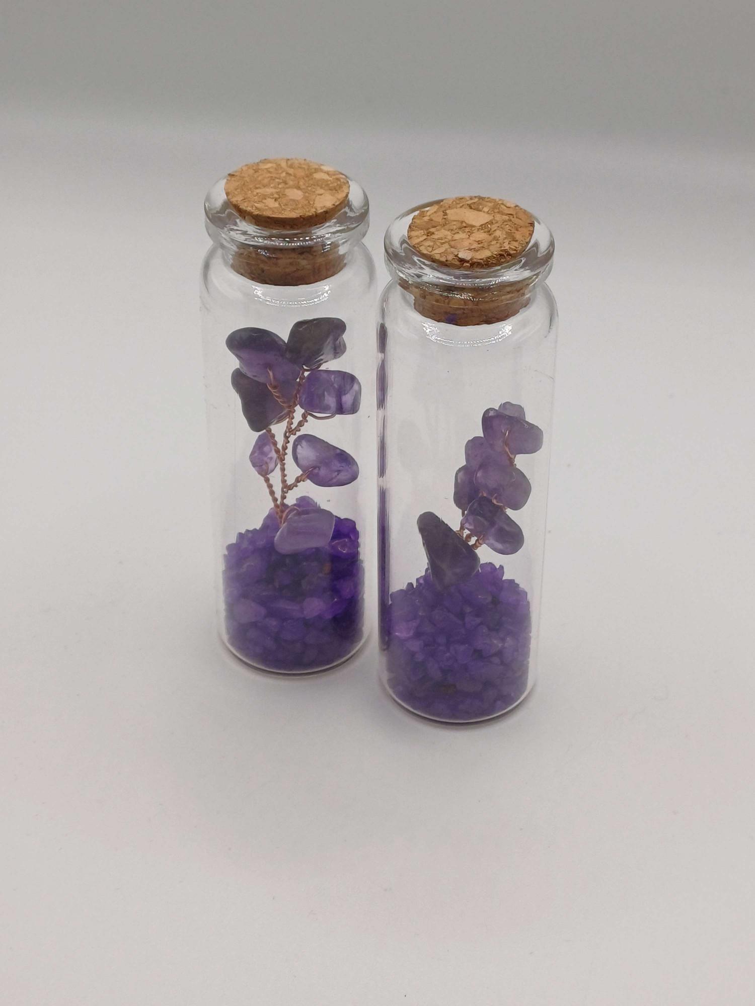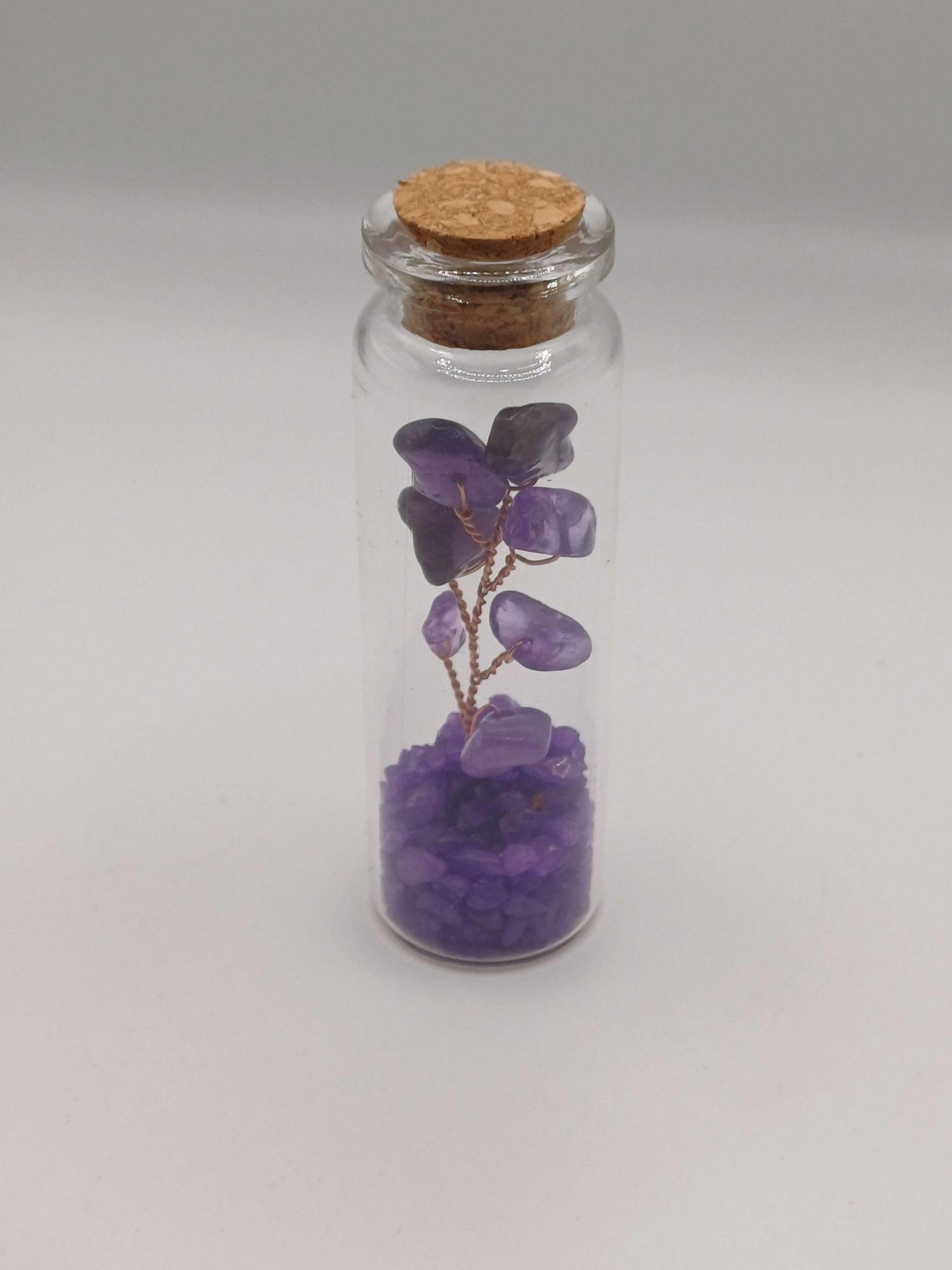 A tiny amethyst Tree of Life enclosed in a glass bottle — a sweet little piece of crystal energy you can keep close for calm and balance.