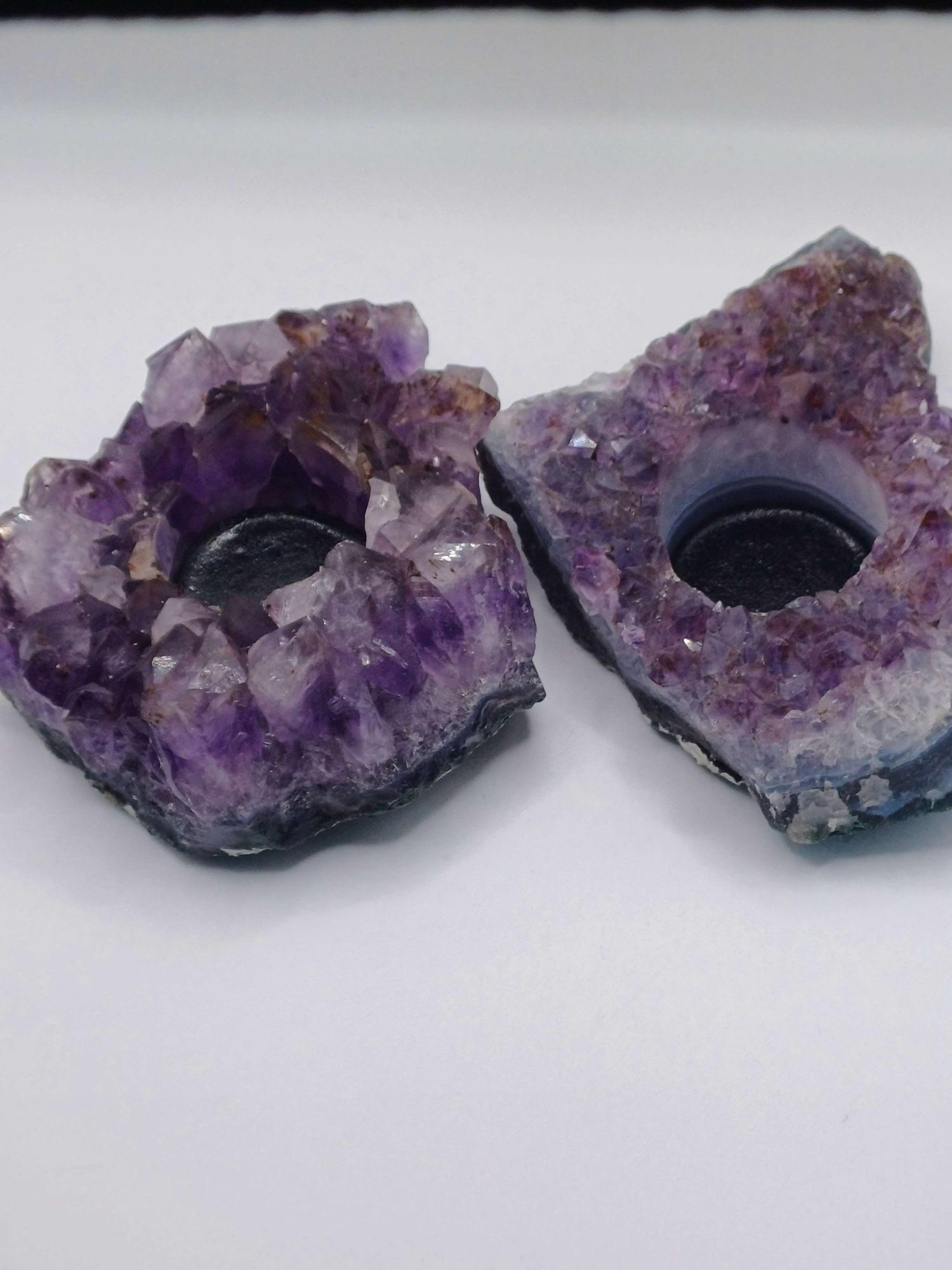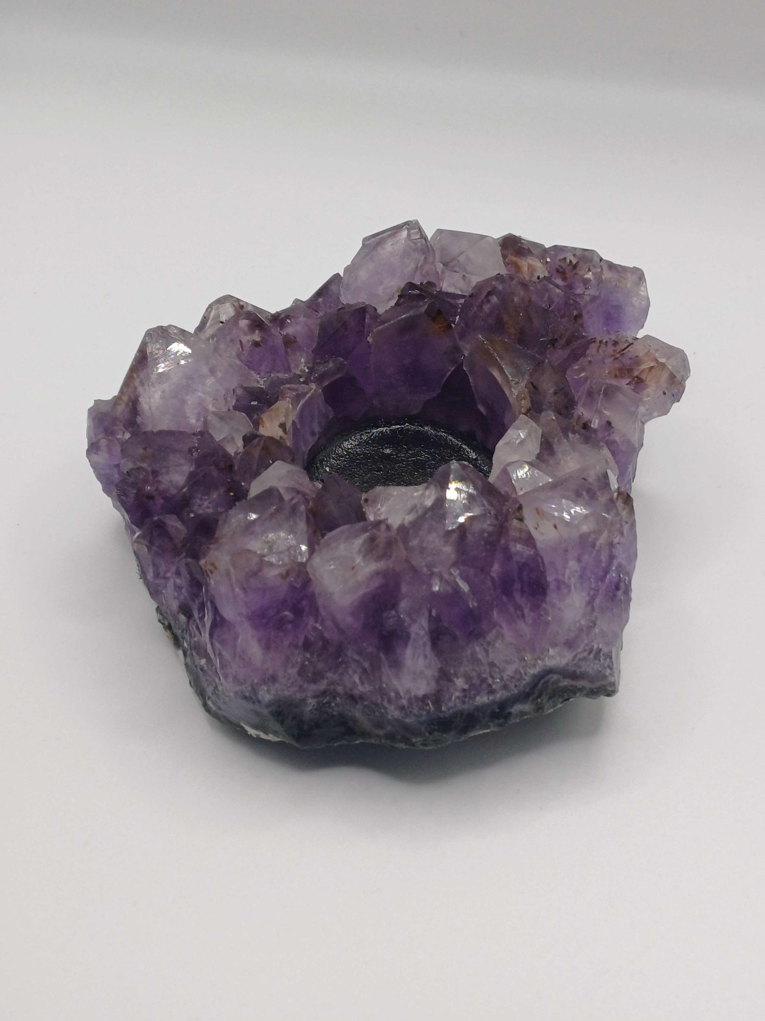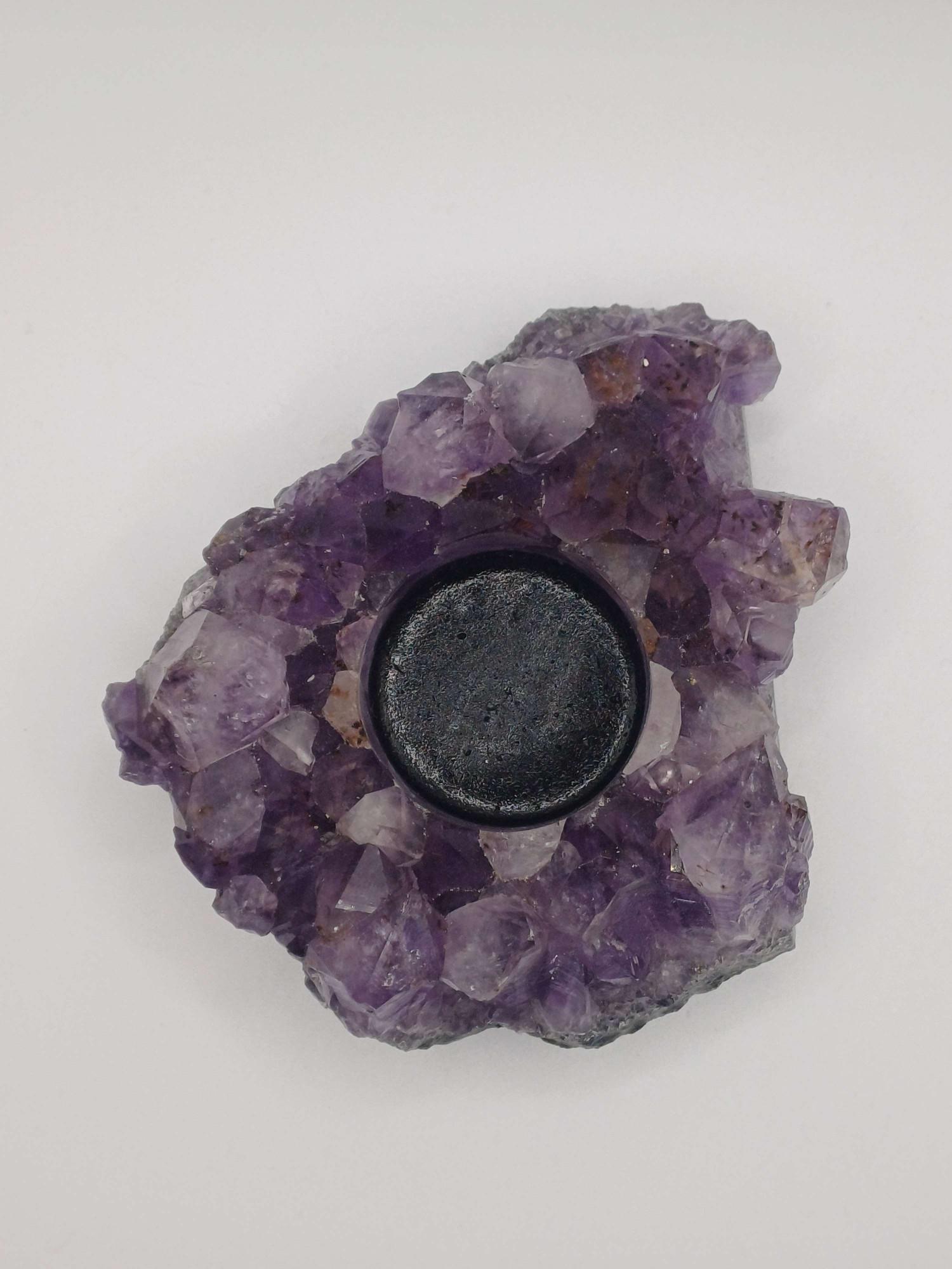 A real amethyst cluster turned tealight holder – sparkling, grounding, and effortlessly calming when lit.