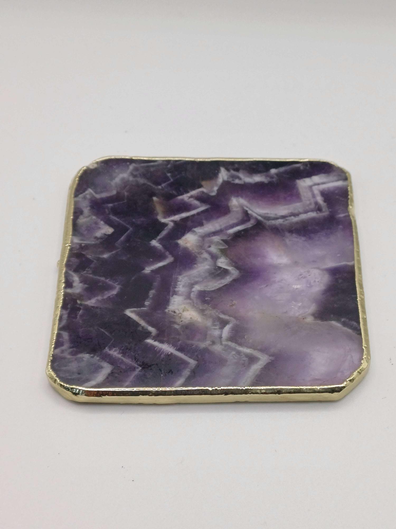 The colours range from soft lilac to deep violet, sometimes with faint quartz lines or darker borders running through. They look incredible under a cup of tea, a candle, or even just as a display piece for jewellery or perfume bottles. They’ve got a gentle shimmer when the light catches them – subtle but special.
