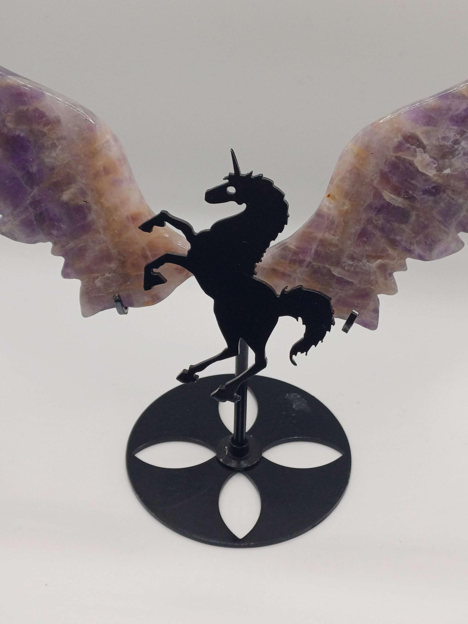 Some crystals feel calm. Others feel powerful. This one somehow manages both. Hand-carved from real chevron amethyst, this winged unicorn pegasus is one of those pieces that instantly feels special. You can see natural waves of purple and white in the stone – soft bands that look like they’re caught mid-sky. Every single one is unique, because nature doesn’t repeat itself.